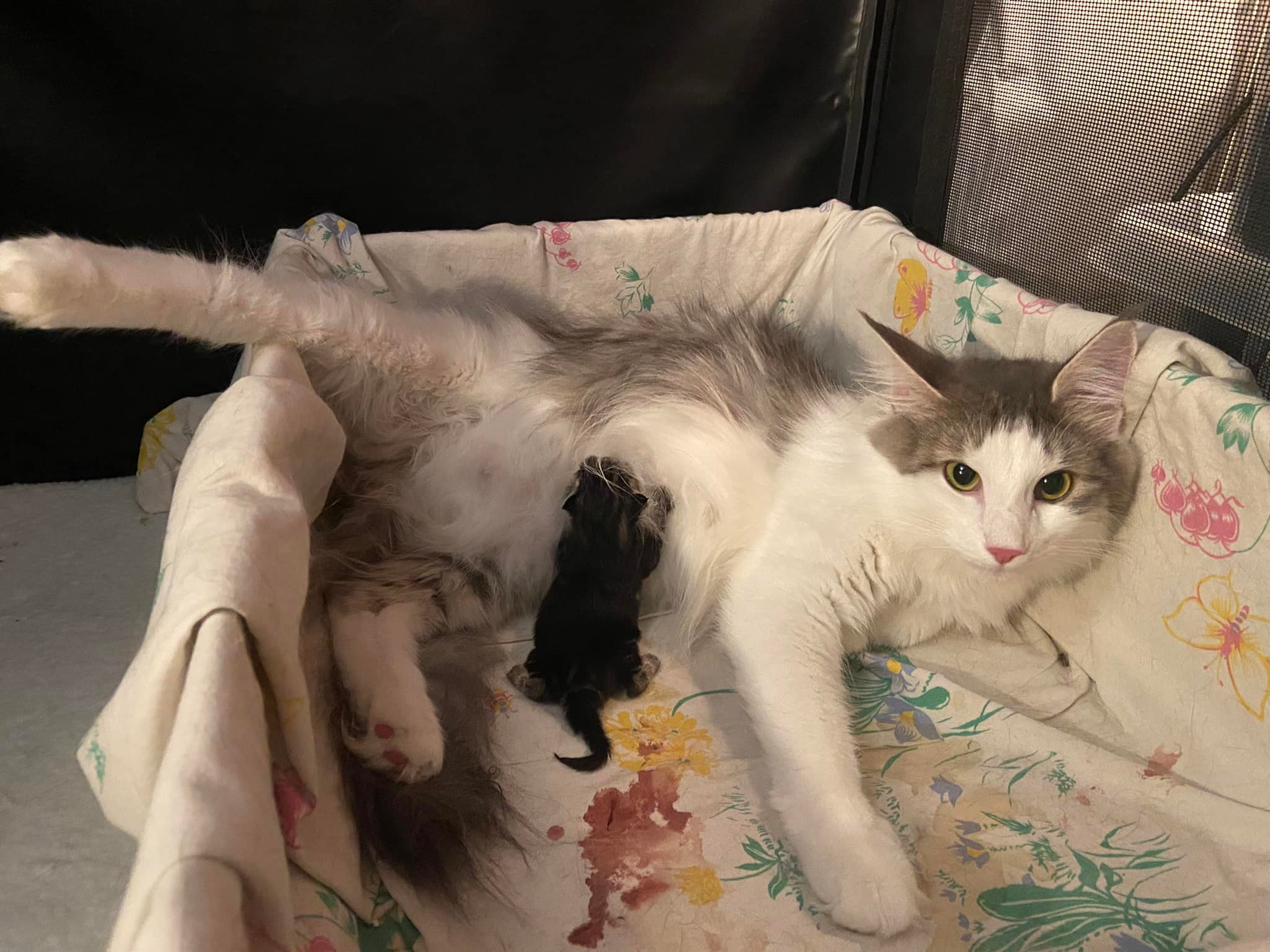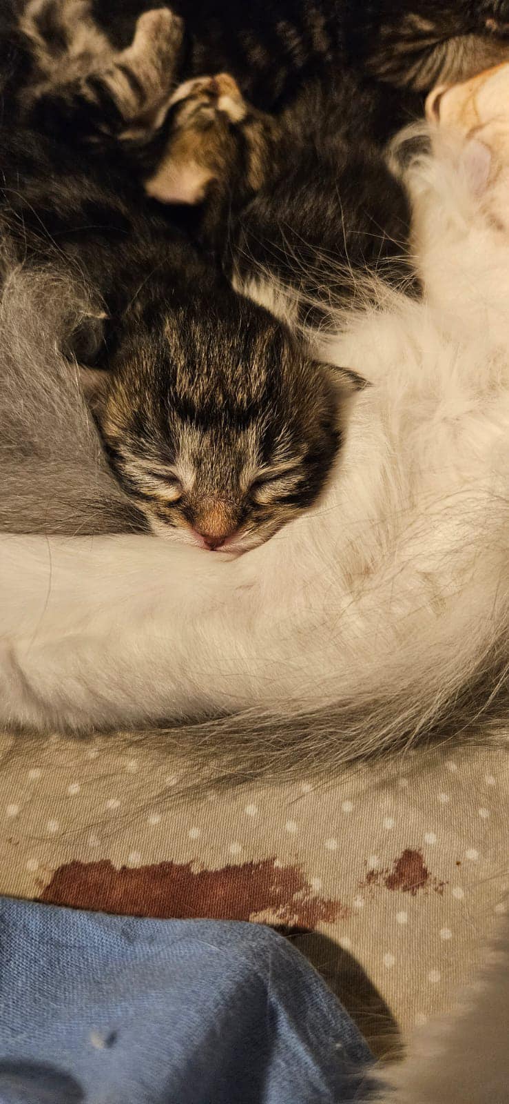 31.08.2023 Sini synnytti aamuyöstä yhden pennun, sitten odoteltiin pitkään. Käytiin aamulla ultrassa tarkistamassa pentujen sykkeet; kolme löytyi ultralla ja sykkeet hyvät. Kaikki oli hyvin, joten palattiin kotiin. Iltapäivästä mentiin uudelleen, yhdellä sykkeet laskeneet. Oksitosiinilla kokeiltiin lähtisikö synnytys etenemään, mitään ei tapahtunut. Otettiin röntgen ja huomattiin, että pentuja on 3 sijaan vielä 4. Illasta sektioitiin ja 4 pientä lisää tuli maailmaan. Synnytysvaikeuden syyksi todettiin yhteentörmäys; kaksi pentua oli yrittänyt syntyä samaan aikaan. Emo ja pennut voivat mainiosti! Yhden kanssa oli alkuun hieman huolta, mutta kaikki virkosivat hyvin. Super isot kiitokset CatVetin henkilökunnalle <3