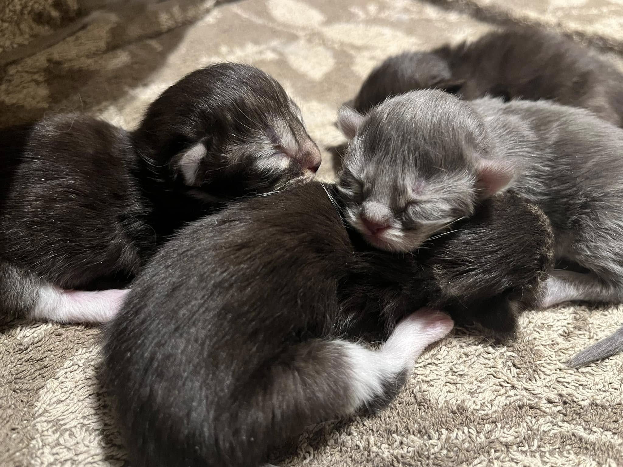12.2.2025 Kolme viikkoiset pienet, painot laahasivat minimissä tässä juuri ennen kiinteitä ja arvottiin hetken olisiko tarvetta lisäruokinnalle vaiko ei, lopulta siihen ei päädytty. Kiinteän maistelu aloitettu, vaikka vielä ei kovin kiinnosta. Myös hiekkalaatikko harjoittelu aloitettiin.